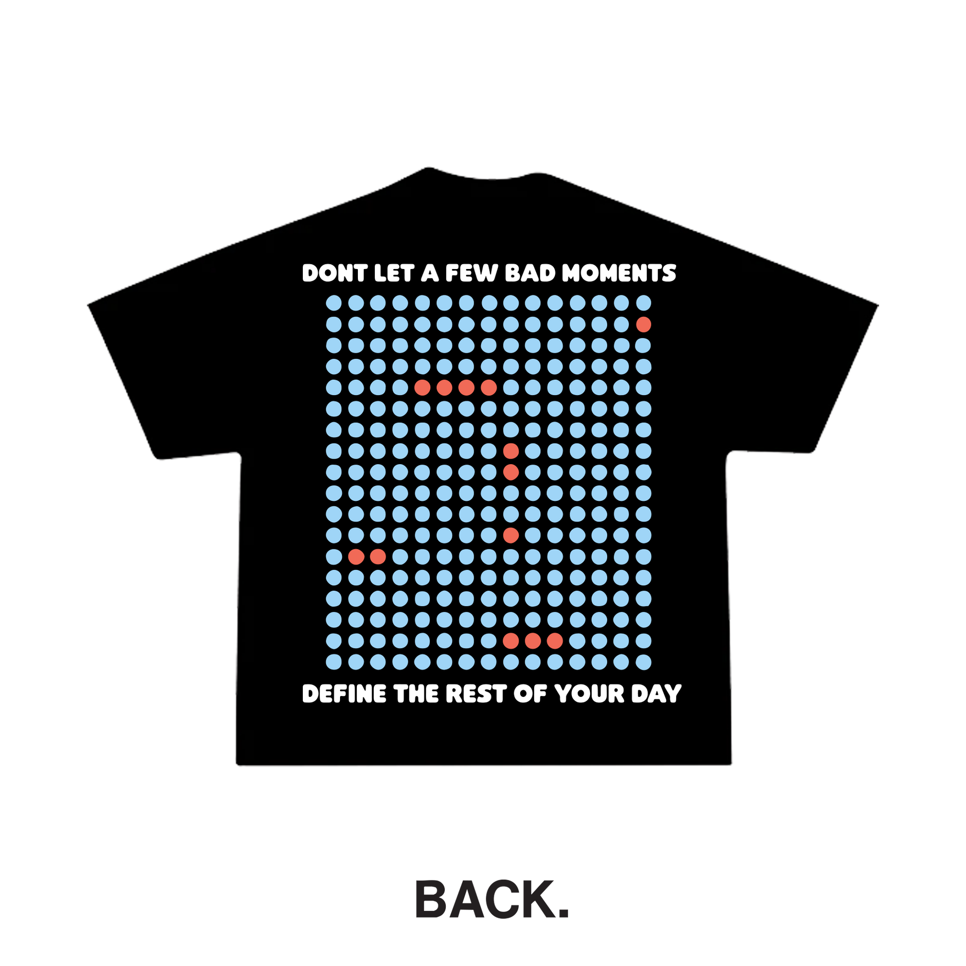 Few & Far Tee: Embrace the beauty of positivity with the Few & Far Tee. Featuring a design of predominantly light blue dots, representing the good moments in life, alongside a few contrasting red dots symbolizing challenges, this tee serves as a powerful reminder not to let fleeting negative moments define your day. Wear it with pride and celebrate the abundance of good in your life!